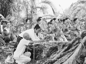 此外,人們還要定期對竜林舉行祭祀,以祈求來年風(fēng)調(diào)雨順、五谷豐登、村寨安寧。如果有人破壞了竜林,整個村寨要舉行專門的祭祀,以示賠禮道歉,乞求祖先的寬恕。