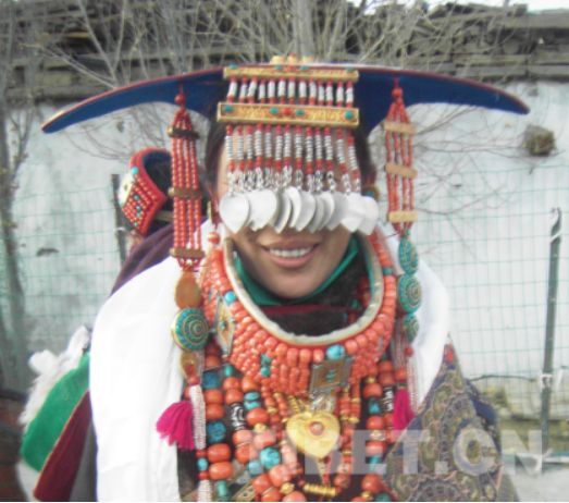 頭飾是普蘭飛天服飾的重要組成部分,一般由綠松石和珊瑚點(diǎn)綴,一個做成的飛天頭飾沒有幾萬元是買不下來的。當(dāng)然,那些鑲嵌其上的寶石決定了其價(jià)格的高低。普蘭市場中有一些尼泊爾商人專門制作那種頭飾,然后靜等當(dāng)?shù)厝罕妬磉x購。