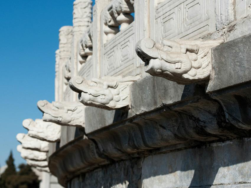 北京天壇祈年殿有三層月臺,第一層月臺上的排水構(gòu)件是云頭,第二層的是鳳頭,第三層則是龍頭,這個龍頭就是螭首(chī shǒu)。同樣,故宮太和殿龍鳳云紋的望柱下就有排水螭首1142只,可以想見當(dāng)大雨滂沱之時,螭首千龍吐水是何等壯觀的場面。