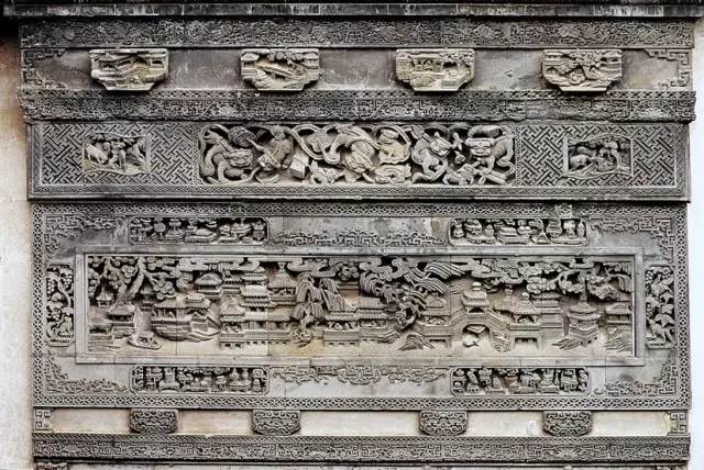 磚雕指在青磚上雕出山水、花卉、人物等圖案,是古建筑雕刻中很重要的一種藝術形式。