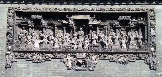 廣東磚雕按技法分淺浮雕、高浮雕和透雕,按規(guī)模分組合磚雕(先單個注模,然后組合成一個完整的圖案)和單塊磚雕。組合磚雕一般用于墻頭、柱頭、照壁等大面積的裝飾,大者需數百塊磚雕組成。單塊磚雕則常鑲嵌于神龕邊框或相飾、座飾等處。