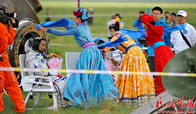 2013年6月26日,神舟十號返回艙平安返回,圓滿完成任務(wù)的三位航天員張曉光、聶海勝、王亞平自主出艙后接受蒙古族牧民的祝賀(吳運生 攝影)