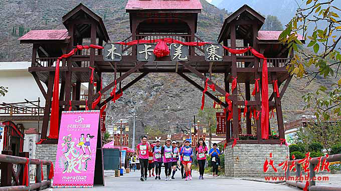 運動員經(jīng)過美麗的理縣木卡羌寨。
