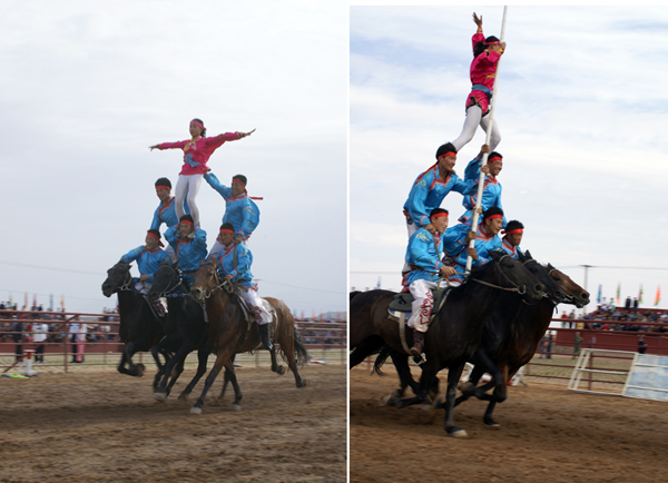 蒙古族的馬術(shù)表演非常精彩,有很多項目?!翱缭秸系K”是在運(yùn)動場跑道上每隔幾十米設(shè)置一個高1米的跨欄。跑道終端立著一個直徑約2米的火圈,矯健的坐騎從起跑線踏蹄起跑,越過跨欄,鉆過火圈直達(dá)終點(diǎn)?!俺笋R斬劈”是在200-250米的距離之間樹起十幾個目標(biāo)。騎手們手持馬刀,疾馳如飛,經(jīng)過一個個目標(biāo)時舉刀劈砍,刀起標(biāo)落?!榜R上技巧”是由運(yùn)動員們在飛馳的馬背上做出各種造型動作。運(yùn)動員一般八九歲就要在馬術(shù)隊接受嚴(yán)格的訓(xùn)練。技巧表演可分單項和多項,其中又包括單人單馬、單人雙馬、雙人雙馬和多人多馬。一匹飛奔的馬經(jīng)過騎手身邊,騎手可以突然抓住馬鬃翻身上馬,又會突然下馬腳尖點(diǎn)地再躍上馬背。其他技巧還有在馬背上“空翻倒立”“側(cè)方隱蔽”“樓里藏身”以及驚險的“馬上疊羅漢”等表演【如圖,劉軍攝影,編者修剪合成兩圖】。