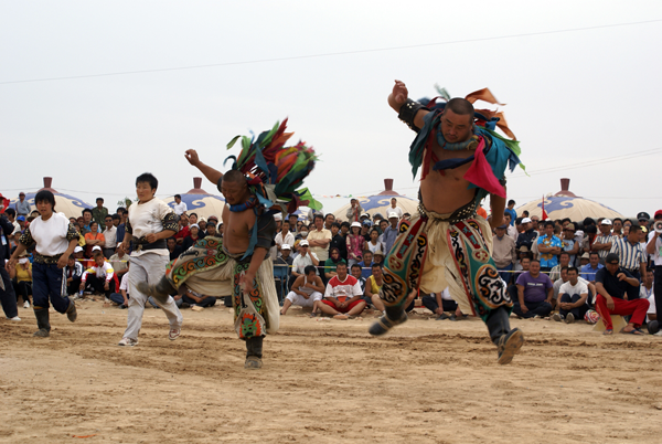 蒙古族摔跤(搏克)既不同于中國式摔跤,也不同于日本的相樸,其規(guī)則、方法、服裝、場地等方面都有自己的特點(diǎn)。比賽規(guī)則和方法是:不分等級(不分年齡、不分體重),沒有人數(shù)限制,只要是2、4、6、8、16、32、64、128等雙數(shù)即可。所有選手由德高望重的裁判負(fù)責(zé)編排配對或抽簽配對后上場。比賽實行單淘汰制,一跤定勝負(fù),失敗者不許再上場。每輪淘汰半數(shù)。裁判員發(fā)令后,雙方握手致意,然后開始交鋒,一般不限時間,可以采取勾、拉、踢、絆、推、抱、舉等各種方法和技巧,但不能抱腿摔,也不準(zhǔn)亂踢,更不能扯褲子,膝蓋以上任何部位著地即為失敗。摔跤手有專用服裝,上身為牛皮或帆布制成的緊身半袖坎肩“昭德格”,下穿肥大的摔跤褲,腳蹬蒙古靴,頸上套五顏六色的布條項圈。比賽場地簡單,只要有一片草坪或松軟空地,觀眾席地圍坐,摔跤手就可以在中間進(jìn)行比賽。賽前,雙方都有人高唱挑戰(zhàn)歌,以造聲勢。摔跤手入場、退場時都要模仿虎步或鷹步動作,跳躍行進(jìn),威武雄壯。冠軍獲重獎,并在民間享有極高聲譽(yù)【圖為跳躍入場的摔跤手,劉軍攝影】。