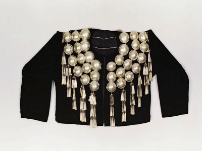 民族文化宮博物館收藏的這件銀飾“孔雀衣”,是景頗族女子盛裝時(shí)的一種服飾,征集于云南省德宏傣族景頗族自治州隴川縣,時(shí)間為20世紀(jì)50年代。這件銀飾“孔雀衣”長(zhǎng)40厘米,胸圍108厘米,黑色平絨布制作而成,圓領(lǐng)對(duì)襟,領(lǐng)部、肩部和胸部墜銀泡、銀鏈、銀穗裝飾,黑白兩色相映成趣,精致華美。銀泡為三圈,由里至外逐圈增大,里層銀泡直徑約2厘米,最外層銀泡直徑約3厘米。外圈銀泡每個(gè)上墜有三角型銀片打制的銀穗,每串分三層,每層分別掛2、4、6個(gè)不等的三角型銀片。整個(gè)上衣幾乎被銀泡、銀鏈和銀穗遮蓋,穿上銀飾“孔雀衣”,銀泡在太陽(yáng)的照射下銀光閃閃,行動(dòng)起來身動(dòng)銀搖,悅耳動(dòng)聽。