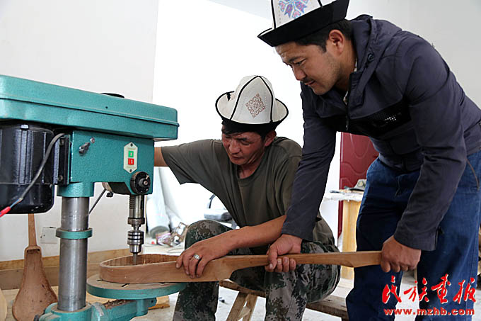 這間工作室的主人叫阿吉?jiǎng)e克·買買達(dá)洪,主人恰巧有事外出,他的弟弟,年輕朝氣的吾蘭別克張羅著給記者們當(dāng)起了翻譯。正忙活著打磨樂器的小伙叫木沙,今年31歲,問起庫姆孜的制作工藝,他才把頭抬起來,笑著說:“我做這個(gè)十年了。一把庫姆孜,往往琴身是杏木,蓋子是松木。杏樹、松樹木切割后放在干燥的地方,一兩年后才能用。”庫姆孜有三根弦,琴弦以前用動(dòng)物的腸子手工自制,現(xiàn)在有的工匠開始使用現(xiàn)成的弦。判斷庫姆孜手工藝人手藝高低的關(guān)鍵何在?木沙解釋說,“要看彈出來的聲音。木頭的原料不同,出來的聲音也不同。”這個(gè)回答似乎也隱藏了手工藝人的絕活所在,可意會(huì)不可言傳的技藝,往往在一代代的工匠手中以師徒親授的方式傳承。