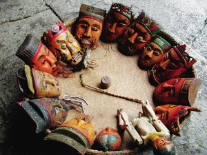 現(xiàn)在的16具面具,是班主宋成權(quán)在1997年春帶著戲班子成員,從正月初一到十五,逐家逐戶跳花燈收賀錢和群眾集資共籌集資,然后由宋成權(quán)到重慶酉陽請師傅雕刻的。