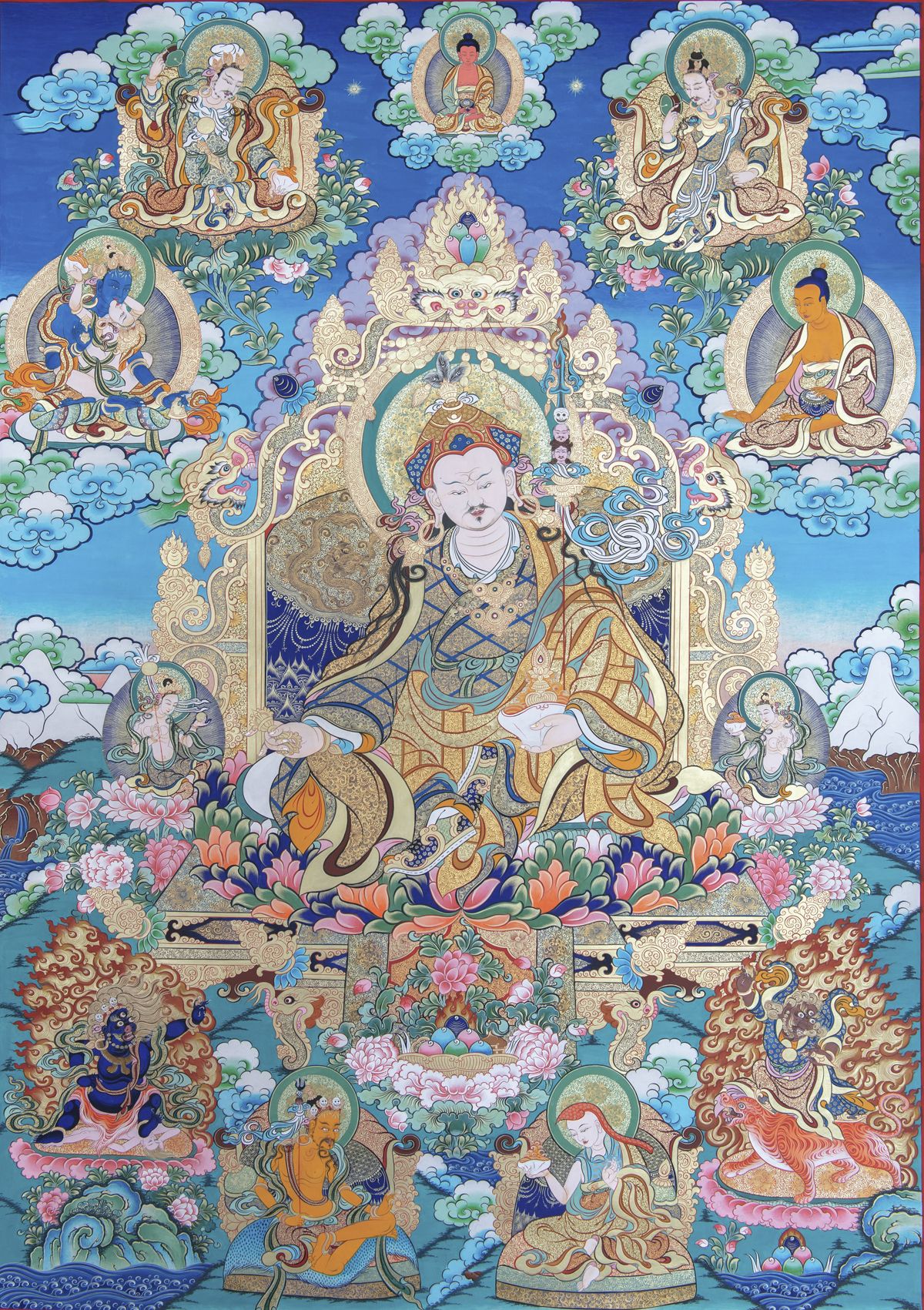 蓮花生大師,印度佛教史上最偉大的大成就者之一。公元八世紀(jì),應(yīng)藏王赤松德贊迎請(qǐng)入藏弘法,成功創(chuàng)立了西藏第一座佛、法、僧三寶齊全的佛教寺院——桑耶寺。他教導(dǎo)藏族弟子學(xué)習(xí)譯經(jīng),從印度迎請(qǐng)無垢友等大德入藏,將重要顯密經(jīng)論譯成藏文,創(chuàng)建顯密經(jīng)院及密宗道場(chǎng),開創(chuàng)了在家出家的兩種圣者應(yīng)供軌范,如是等等,奠定了西藏佛教的基礎(chǔ)。藏傳佛教尊稱他為咕汝仁波切(意為大寶上師)、鄔金仁波切(烏仗那寶)。通稱貝瑪迥乃(蓮花生)。據(jù)多羅那他于1610年所著《蓮花生傳》所載,約于摩揭陀國天護(hù)王時(shí)出生于鄔金國王族。圣誕日:藏歷六月初十。