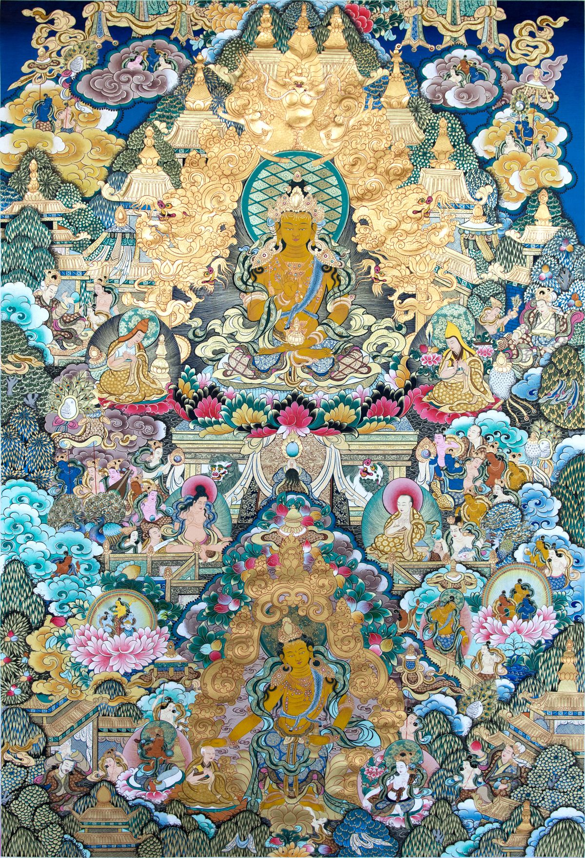主尊未來(lái)世界彌勒佛菩薩,左邊描繪了噶當(dāng)派創(chuàng)世者阿底峽尊者與他的弟子。右邊描繪了格魯派的創(chuàng)世者宗喀巴大師與兩大弟子克主杰和迦側(cè)杰,中部周圍供奉者八大隨喜菩薩文殊菩薩、普賢菩薩、觀世音菩薩、金剛手菩薩、虛空藏菩薩、地藏菩薩、彌勒菩薩、除蓋障菩薩,畫面四角供奉為彌勒佛未來(lái)世界的迎接與弘揚(yáng)佛法的情景。畫面上空描繪了仙女四處飛揚(yáng),空中漂浮著吉祥的圖案與神秘的瑞相等等。整體畫完之后選擇一個(gè)殊勝吉祥的日子點(diǎn)所有諸佛的五官,發(fā)髻、手勢(shì)、法器、畫面后部畫家要親自寫聲、語(yǔ)、法的字號(hào)。作品完工之后寺院里進(jìn)行眾多活佛和高僧大德的加持與開(kāi)光儀式。