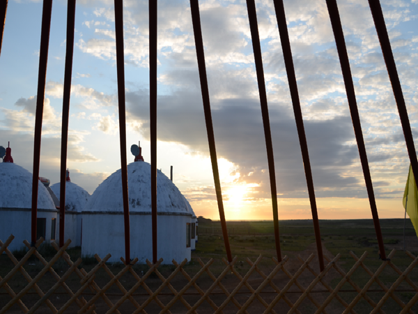 氈門。哈那立起來以后,把網眼大小調節(jié)好,哈那的高度就是門框的高度。門由框定。因此蒙古包的門不能太高,人得彎著腰進。氈門要吊在外面。