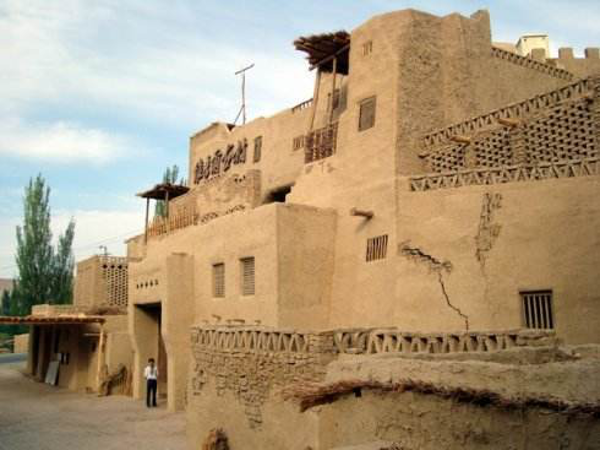 維吾爾族的居室一般是土木結(jié)構(gòu)平房,其建筑方式是以粗木或沙石作基,土塊砌墻,或笆子墻,房頂架梁檁、椽后鋪葦席加土抹泥。房屋平頂,開天窗采光,四壁不開窗只留門,房門忌朝西。現(xiàn)在,建筑式樣發(fā)生變化,多留壁窗,建材也多由土木結(jié)構(gòu),向磚、混凝土結(jié)構(gòu)發(fā)展。室內(nèi)布置過去較為簡單,一般多砌土炕,炕一側(cè)隔矮墻砌鍋臺,墻上留有壁翕,放置物品,喜掛壁毯。冬季多燒爐子、火墻取暖。院內(nèi)多植有葡萄和果樹花卉。房門口兩側(cè)砌土臺,上鋪氈毯,用以夏天乘涼、睡覺。