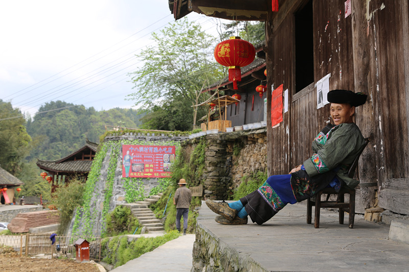 石拔三大媽的家位于村口,老人正在院子里曬太陽(yáng)。這里的苗族習(xí)俗保持得很好,村民日常生活中大多是苗族傳統(tǒng)打扮。大媽頭裹黑帕頭、穿一件綠色繡花苗裝,利落得很。見(jiàn)來(lái)了客人,她趕緊把我往屋里讓。