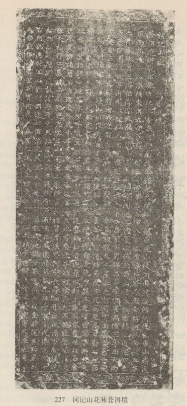 白文碑刻。明楊黼作。景泰元年(1450年)立,原嵌于大理縣作邑鄉(xiāng)慶洞莊圣元寺偏殿前廳北壁,后移至大理縣文化館。碑文14行,陰文正體,從右到左直行書寫。首行為題,其余正文,共13行,每行40字,只第9行41字,末行39字。全詩(shī)20節(jié),每?jī)晒?jié)為一聯(lián),共10聯(lián)。前4聯(lián)詠蒼山洱海的自然景色和地勢(shì)名勝,后6聯(lián)抒作者之情感。以白語(yǔ)吟誦,優(yōu)美動(dòng)聽(tīng)。這是目前保存最為完好的一塊白文碑。傅懋勣、肖雷南在40年代曾根據(jù)郭純?nèi)实淖x音注解此碑,有油印本。石鐘健、楊燦然、徐嘉瑞亦對(duì)此碑加以研究。1957年,徐琳、趙衍蓀以郭純?nèi)首x音為本,用國(guó)際音標(biāo)記音,并加翻譯?!睹褡逭Z(yǔ)文》1 980年第3期載有釋讀文章。