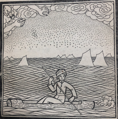 厄霞看見札努札別依然沒(méi)有餓死,又想出了一條毒計(jì):他把天河上的水放下來(lái),整個(gè)大地變成白茫茫一片汪洋大海。跑到高山去的人僥幸沒(méi)有淹死。住在平地上的人,都被洪水淹死了,厄霞以為這一次札努札別也一定淹死了。但當(dāng)厄霞來(lái)看時(shí),札努札別坐在掏空了的木槽里漂在水面上,依然沒(méi)有淹死。于是,原來(lái)不知道造船的人們,從這次起,后世便知道造船了。