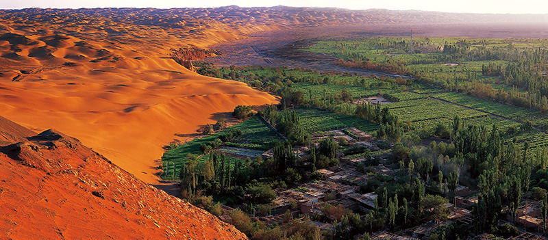 我的頭上,身體上,落滿了恢宏的土黃色。吐峪溝的清真寺、麻扎是土黃的,千佛洞、佛塔等遺跡是土黃的,無數(shù)古老民居的石階、葡萄晾房是土黃的,就連火焰山南的樹柏溝、二塘溝、斯?fàn)柨烁希€有魯克沁綠洲的東南邊緣的庫木塔格沙漠都像是土黃的冊頁,漫卷在這火焰般的吐魯番的綠州內(nèi)部。