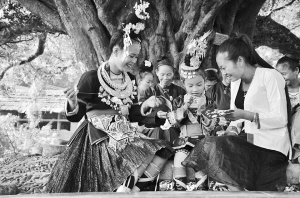 陸婷(右一)與當?shù)乩C娘交流侗繡技藝。