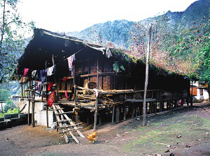 在怒江上游峽谷聚居的傈僳村寨都建在高山的半山上,其民居俗稱為“千腳落地房”。說“千腳落地”雖有些夸張,但也足以形象地說明峽谷溫?zé)岬臍夂蚝蜕礁咂露傅牡乩項l件。在雨季時,“千腳”阻力最小,使山洪順利傾瀉而下,又很快干爽,免受潮氣。而且不需挖地動土,不必移石砌墻,對木料沒有過高要求,長短皆用,在生態(tài)脆弱的高山峽谷也算環(huán)保建筑?!扒_落地”是因建房時先在確定的屋基上依斜坡程度和住房面積打進數(shù)十根到百余根木樁為基樁,以保證居室樓板的平正?;鶚洞蚝煤?,除四面留幾根高柱作為整個房屋的立柱外,在密集木樁所形成的平面上滿鋪竹篾編織的樓板,還有竹篾圍墻,所有結(jié)構(gòu)皆用竹篾綁扎。屋頂鋪苫草或蓋木片瓦,近幾年,已陸續(xù)換上了大塊的水泥波形瓦。房門開在山墻一側(cè),有廊道,可做曬臺,平時穿的衣服都搭在這兒,也是婦女做針線活的地方。隨著怒江峽谷的開發(fā)和新農(nóng)村建設(shè)的深入,通路的村寨將很快會改變面貌。