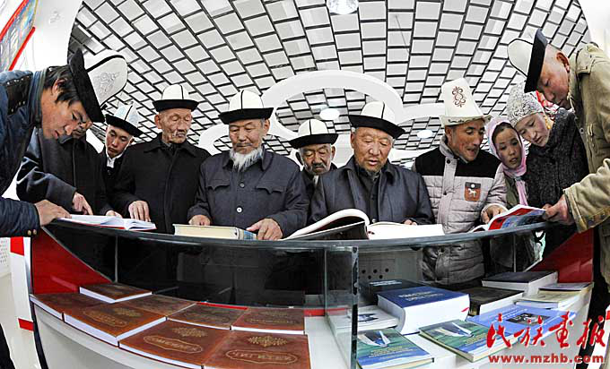 阿合奇縣哈拉布拉克鄉(xiāng)《瑪納斯》博物館里,人們在翻閱有關瑪納斯的作品