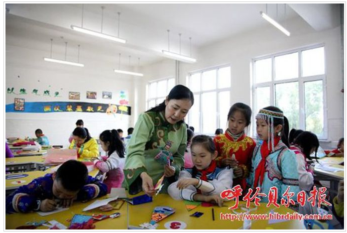 蘇梅在莫旗民族實驗小學(xué),指導(dǎo)孩子們制作達斡爾族玩偶哈尼卡