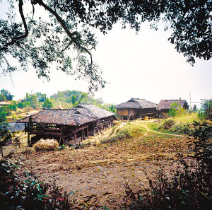 云南省潞西市三臺(tái)山鄉(xiāng)的德昂族居住分散,村寨很小,大都建在高半山上,山路行車?yán)щy。傳統(tǒng)住房為正方形干欄式竹木建筑,房屋兩層,為木柱結(jié)構(gòu)框架,竹篾編片圍墻,粗竹劈壓成自然的竹片做樓板,屋頂苫草排,當(dāng)?shù)厮追Q“草帽頂房?!?/p>