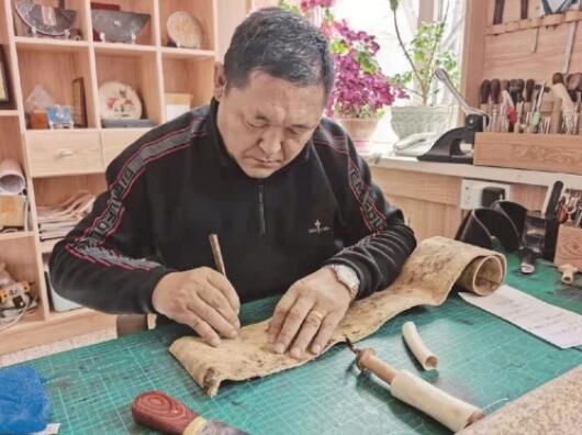 “觸網”是萬德順應時代的一次嘗試,也是他手工皮藝之路的又一次轉型。12歲時,他從馬背上摔下來,在舅爺家休養(yǎng)時第一次接觸到皮雕,并與皮雕結下不解之緣。42歲時,萬德在手術中發(fā)生意外導致癱瘓。經歷了迷茫、絕望的他,決定重拾老祖宗留下的手工皮藝,在輪椅上把傳承家族皮雕手藝作為后半生奮斗的事業(yè)。