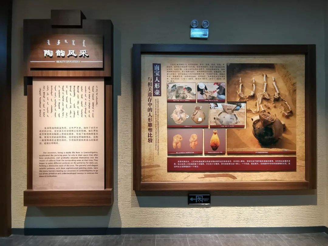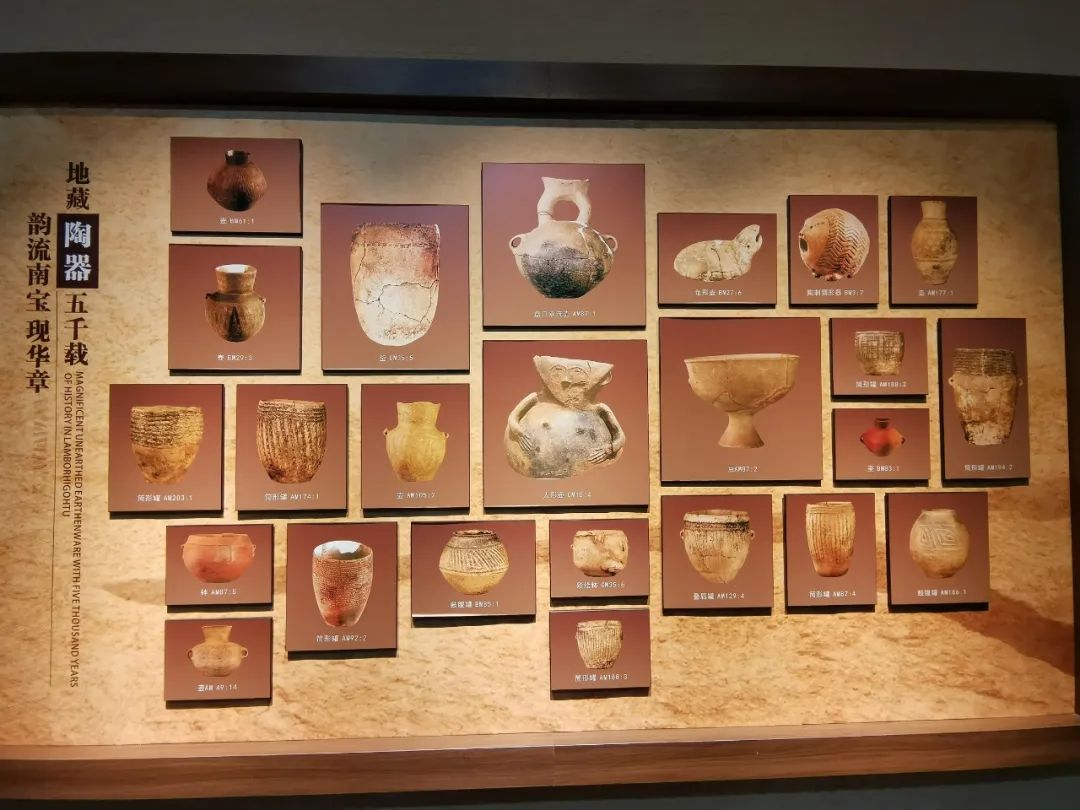 陶韻風(fēng)采;生活穩(wěn)定的南寶先民,在生產(chǎn)之余,加快了對(duì)藝術(shù)追求的步伐,接受來自周鄰?fù)谖幕挠绊?,他們開始在日常使用的陶器上面描繪圖案,形成了獨(dú)特的南寶風(fēng)格。雍容華貴的彩陶?qǐng)D案,紋樣繁復(fù)的劃刻特點(diǎn),宛如一面面飄揚(yáng)在這里的旗幟,引領(lǐng)著南寶先民走出原始泥沼,迎接文明曙光。