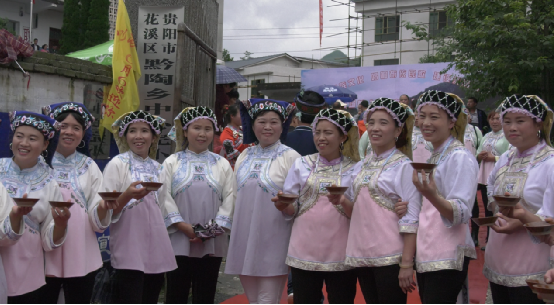 布依族青年們抬著族中神物銅鼓,吹著長(zhǎng)長(zhǎng)的號(hào)角,臉上滿是對(duì)民族節(jié)日的期待之情,驕傲又興奮;成群結(jié)隊(duì)的孩童穿著本民族傳統(tǒng)服飾,手拿錦帶,熱忱歡迎遠(yuǎn)道而來(lái)的客人;能歌善舞的布依阿姐笑臉相迎,唱著布依族的歌謠,一字排開(kāi)堵在門前,客人們想要進(jìn)去參加這次盛會(huì),就得過(guò)三關(guān),干了三碗攔路酒。