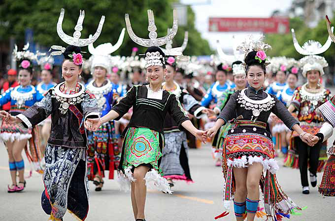 2017年4月28日,黔東南苗族侗族自治州丹寨縣盛大舉行“云上丹寨?遠(yuǎn)古霓裳”丹寨八大支系服飾巡游活動(dòng),來自全縣六個(gè)鄉(xiāng)鎮(zhèn)八大支系的2000余名苗族同胞身著節(jié)日盛裝,集聚在縣城錦雞廣場進(jìn)行服飾展演(黔東南苗族侗族自治州人民政府網(wǎng))