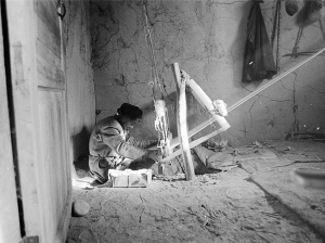 紡線車高約80厘米,寬約60厘米,長約22厘米。紡線車也和切克曼一樣古老,完全靠手工搖,沒有絲毫機械動力。老人紡線時,右手搖動紡線機,左手慢慢放絨,把比普通棉紗線粗兩三倍的絨線纏繞在錠上。這個工序叫做加捻和卷繞。隨著紗條抽長拉細,纖維變得更加平直,紗條強力下降,容易斷裂或延伸,因此需要加上適當(dāng)捻度使其具有一定的強力。這個過程結(jié)束后,老人起身說:“經(jīng)過加捻和卷繞之后,要用水沖洗,晾干后就可使用了。”