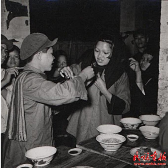 “歌圩”是桂西壯族古老的風(fēng)俗。每年農(nóng)歷正月、二月、四月都有歌圩日。圖為1957年廣西壯族自治區(qū)憑祥市郊區(qū)的歌圩日,這里不但處處歡歌笑語(yǔ),還有搶花炮、演壯戲、舞彩龍、舞彩鳳、唱桂劇等很豐富的文娛活動(dòng)