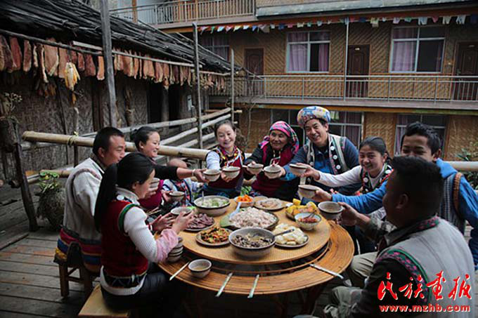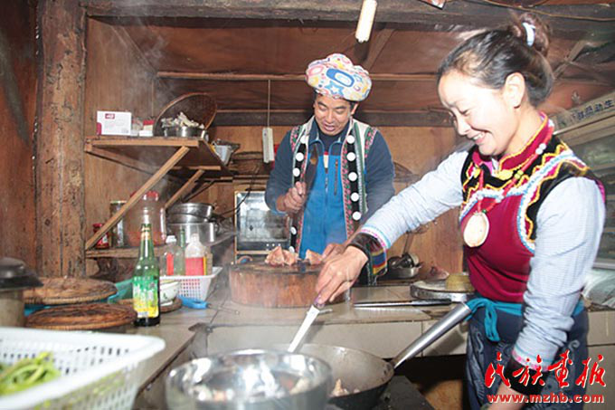早上,老姆登村73歲的怒族老人斯普早早起來招呼兒子郁伍林、兒媳魯春花:“春節(jié)快放假了,客棧的生意會忙得不可開交,趁著現(xiàn)在客人不多,家里人先吃一頓團圓飯吧?!彼蛊绽习樵缒赀^世,7個兒女中老五郁伍林在身邊照顧她?!斑^去在春節(jié)才能吃上一頓好飯菜,也要準備很長時間,現(xiàn)在每天都有好吃的,天天在過年,多虧了黨的好政策?!闭f起今天的幸福生活,生在舊社會的斯普感慨萬千。