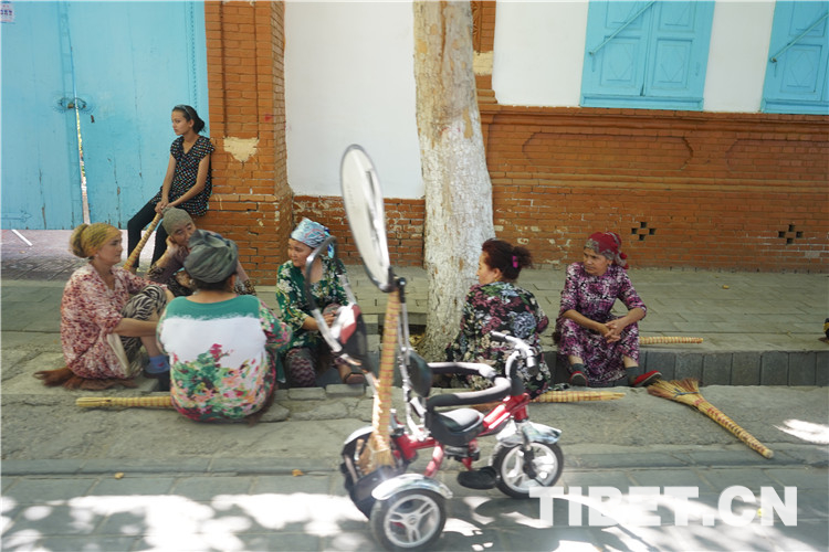 走在喀贊其街頭,可以看到穿著鮮艷花色連衣裙的維吾爾族婦女、扎著漂亮方形頭巾的哈薩克族姑娘、戴著白色圓帽的回族老漢……如同觀看一場民族服裝表演。圖為喀贊其老街上的“悠閑時(shí)光”。