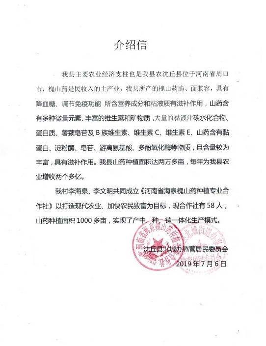 因為“槐三寶”的效益明顯,合作社于2013年成立之初吸納社員102戶,種植面積達(dá)1000多畝。2014年5月,“槐三寶”商標(biāo)順利通過國家農(nóng)業(yè)部無公害農(nóng)產(chǎn)品認(rèn)證和無公害農(nóng)產(chǎn)品標(biāo)識使用權(quán),基地獲河南省農(nóng)業(yè)廳無公害農(nóng)產(chǎn)品產(chǎn)地認(rèn)定。發(fā)展到現(xiàn)目前,2019年,其種植面積已經(jīng)超過4000畝,產(chǎn)量在5500噸以上。據(jù)合作社監(jiān)事李文明講:“今年沒澇,現(xiàn)在七月,山藥快成熟了,可以預(yù)見,是個豐收年。”
