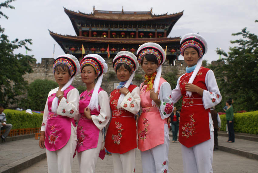 一直以來,享有“金花”美譽(yù)的白族婦女的服飾,更是色澤鮮美、絢麗多彩。大理一帶的婦女多穿白上衣、紅坎肩或是淺藍(lán)色上衣配絲絨黑坎肩,右衽結(jié)紐處掛“三須”“五須”的銀飾,腰間系有繡花飄帶,下著藍(lán)色寬褲,腳穿繡花的“白潔鞋”。手上多半戴紐絲銀鐲、戒指。已婚婦女梳發(fā)髻,未婚少女則垂辮或盤辮于頂,有的則用紅頭繩纏繞著發(fā)辮下的花頭巾,露出側(cè)邊飄動(dòng)的雪白纓穗,點(diǎn)染出白族少女頭飾和發(fā)型所特有的風(fēng)韻。劍川一帶的年輕女子則又喜戴小帽或“魚尾帽”。洱源西山及保山地區(qū)的白族婦女常束發(fā)于頂,上插銀管,再以黑布包頭,穿右襟圓領(lǐng)長(zhǎng)衣,系繡花腰帶,衣袖和褲腳喜鑲繡各色寬窄不同的花邊,有的還喜束護(hù)腿,顯得十分勻稱協(xié)調(diào)和俊俏美觀??傊?,各地白族的服飾雖呈現(xiàn)出某些地區(qū)性的差異,但都色彩明快、映襯協(xié)調(diào)、挑繡精美、古雅端莊。