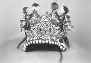繡花帽由里外兩部分組成,素有“制做繡花帽,先做好襯套”之說。即先按兒童頭徑大小制襯套,做法較簡(jiǎn)單,用染過的家織布做里襯,鋪上薄棉,外層為紅綢面,用線依次納緊,以防棉花下滑,縫成筒狀后,頂部用同樣的材料剪成四方形,與上部帽沿結(jié)構(gòu)相同即成。后部分較前部分復(fù)雜,先將染過的兩層家織布粘牢,表面貼上各色緞面,顏色自定。把圖樣拓在緞面上,剪下形狀不同的6片材料,把喜愛的圖案描繪在上面,接著用紡車紡出6根各4米長(zhǎng)的棉線,用吊砣逐根旋轉(zhuǎn)纏繞白色呢絨線,經(jīng)濃縮,每根僅得到1米左右線料,將這制好的精線按圖案盤弄,后以花針固定,再輔以其他色線刺繡成圖案點(diǎn)綴其間。把繡好的6片材料組合到襯套上,各片邊沿用黑白兩色線交替鎖邊,帽口用黑金絨布滾邊。此時(shí),帽頂?shù)模吨患饨怯貌噬€制做成圓球裝飾,外面四角下面懸吊白色珍珠串,末端垂著布制五角星。帽的周邊釘上銀制品,最后鑲上反光小圓點(diǎn)飾物似天上星星般光亮,給本就精致美觀的繡花帽增添了一道靚麗色彩,繡花帽就這樣在侗家女的手中誕生了。