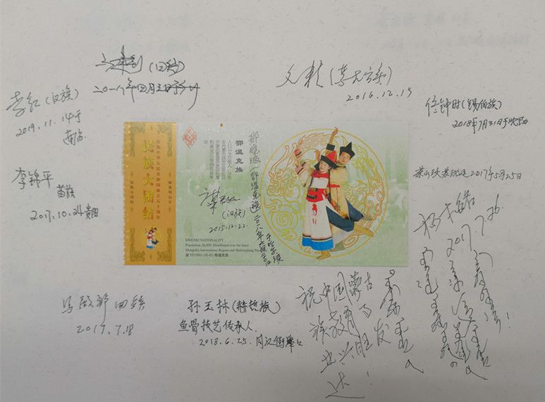 在采集口述影像錄音資料的同時(shí),項(xiàng)目組還收集了大量的珍貴歷史照片以及相關(guān)文物。值得一提的是,他們?cè)O(shè)計(jì)了一種非常有特色的受訪者簽名簿,中間貼著繪有56個(gè)民族的音樂舞蹈圖案的首日封或明信片,四周簽上受訪者的人名簽名字、民族特征,有些還用民族文字書寫,體現(xiàn)了中華各民族團(tuán)結(jié)在一起的精神風(fēng)貌。簽名簿有厚厚的幾大本,設(shè)計(jì)精美,承載著民族工作口述史資源采集的經(jīng)歷,具有豐富的文化內(nèi)涵和博物館收藏價(jià)值。