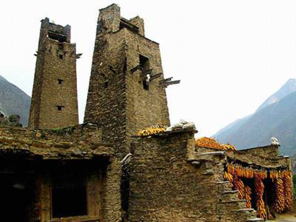 在羌語(yǔ)中,碉樓被稱為“邛籠”,意為美麗、高貴的房子,早在2000年前《后漢書·西南夷傳》就有羌族人“依山居止,壘石為屋,高者至十余丈”的記載。碉樓的高度在十米至三十米之間,用于御敵、貯存糧食和柴草。碉樓有四角、六角、八角幾形式,有的高達(dá)十三四層。建筑材料是石片和黃泥土,墻基深1.35米,以石片砌成。石墻內(nèi)側(cè)與地面垂直,外側(cè)由下而上向內(nèi)稍傾斜。修建時(shí)不繪圖、吊線、柱架支撐,全憑高超的技藝與經(jīng)驗(yàn)。建筑穩(wěn)固牢靠,經(jīng)久不衰。自唐朝來(lái),羌族人民因各種原因向西北遷移,到了西藏和青海,所以現(xiàn)在,羌族碉樓也往往被稱為藏族碉樓。