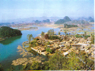 在一次學術(shù)會議上,筆者請教了首倡并主導(dǎo)“民族文化生態(tài)村”試點建設(shè)的尹紹亭教授,得知在他們首期的五個試點村落建設(shè)中,仙人洞村是比較成功的,于是在本項目的調(diào)查中,仙人洞村成為重點考察的對象之一?!跋扇硕匆妥逦幕鷳B(tài)村”位于云南丘北縣城西北16公里的普者黑湖畔?!捌照吆凇睘楫?shù)匾妥迦瞿嵴Z,意為“魚蝦多的湖潭”。普者黑實際是由眾多湖泊、河流構(gòu)成,總面積達165平方公里,已經(jīng)開發(fā)成由5個景區(qū)、56個景點組成的滇東南國家級著名旅游景區(qū)。