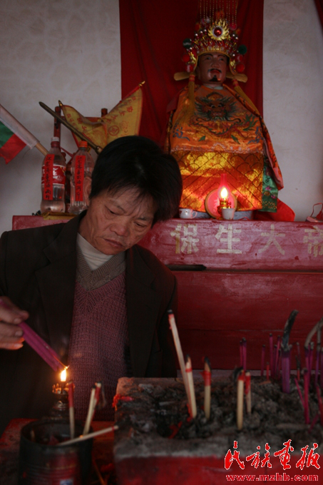 兩年來,作為保生大帝廟守廟人,江云山早上起來最重要的事情就是打開廟門,給諸神上香,敬茶。除了保生大帝神外,廟里還供奉有關公和文昌君。人們一般向關公神祈求發(fā)財,向文昌君神祈求兒女考上大學,早日成才。江云山說,只要真心信奉,人們來年各方面的愿望都會得到神靈的保佑。