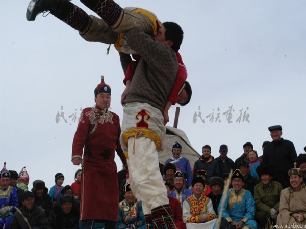春節(jié),蒙古人稱為“白節(jié)”、“大年”,是蒙古人傳統(tǒng)節(jié)日,時間在農(nóng)歷正月初一。居住在農(nóng)村、城市、工礦區(qū)的蒙古族過春節(jié)的習俗同漢族差不多,但牧區(qū)有許多不同的特點。除夕之夜為“守歲”,合家老小席地坐在蒙古包中的矮桌周圍,桌上擺著一盤盤香噴噴的肉類、奶食品,以及糖果、香煙、美酒等物,有的還要在矮桌上供一張大紙,紙上寫著祖先的名字。午夜,開始飲酒吃年飯,或吃除夕餃子。按規(guī)矩團圓之宴要多吃多喝酒、肉,食器要擺滿滿一席。如吃不完也要剩得越多越好,象征新的一年里吃喝不盡、年年有余。家里的年輕人,要向長者敬“辭歲酒”。特別有意思的是全家共吃一塊由酥油、糖、白面烙成的大圓餅,這叫吃新年餅,每人只吃一口,意思是全家永不分離,永久團圓,永遠過甜甜蜜蜜的日子。除夕之夜要?!案吕尽保ㄍ嫜蚬穷^)、說書、唱歌、跳舞,通宵達旦,熱鬧一宿。過大年,按習慣還要拜年,大年三十晚上為辭舊歲禮, 初一早上為迎新年,晚輩給父母和老人叩頭、敬酒、獻哈達,祝老人們身體健康,晚年幸福!老人擁抱孩子們,并斟上一碗鮮奶,祝愿子女們幸福,像牛奶一樣純潔。大年初一早餐后,男女盛裝,三五成群來到浩特(村鎮(zhèn)),挨家串戶給親友拜年??腿诉M屋首先向長輩叩頭拜年,祝愿老人身體健康,年豐人壽。按習慣由主人家的女婿向客人逐個敬酒,每敬必喝,或邊喝邊唱,邊唱邊舞。