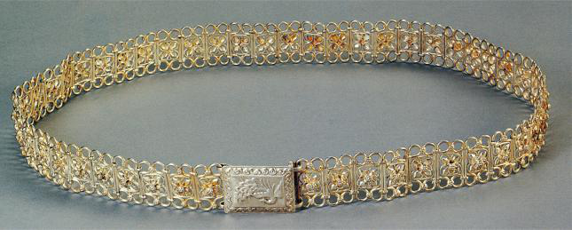 傣族銀腰帶傣族婦女喜歡帶手鐲、戒指、耳墜、項(xiàng)鏈等,這些物飾金質(zhì)、銀質(zhì)、玉石均可,仿制品也行。女嬰生下來(lái)幾天,就由家長(zhǎng)用消過(guò)毒的針為娃娃扎耳,為帶耳環(huán)作準(zhǔn)備。對(duì)女性而言,銀腰帶更是不可缺少之物,腰帶上飾以孔雀、蓮花等各種花型。女人們認(rèn)為銀腰帶越寬就越美(圖為傣族銀腰帶,以上圖片為中央民族大學(xué)博物館館藏)。