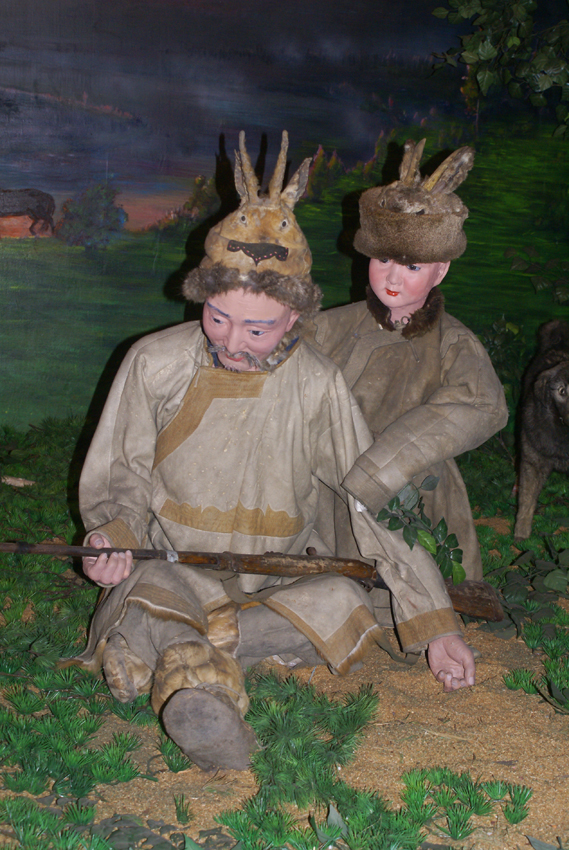 狩獵經(jīng)濟(jì)在鄂倫春族社會(huì)中維持了幾千年,一人一匹獵馬一桿槍?zhuān)偌由蠋讞l獵狗和一片獵場(chǎng),幾乎就是鄂倫春族的全部生產(chǎn)力。而槍支的傳入也不過(guò)才300多年的歷史,在此之前使用石塊和木棒狩獵,后來(lái)發(fā)明了扎槍和弓箭,與外界幾乎隔絕,純粹的食獸肉、衣獸皮。鄂倫春族最早使用的獵槍是被稱做“俄羅斯鳥(niǎo)槍”的火槍?zhuān)@是清朝的察邊官吏、外民族及俄國(guó)商人交換給他們的。有火繩槍、火鐮槍和泡子槍三種,都是從槍筒裝入火藥或鉛彈,只是引爆方式不同。民國(guó)以后陸續(xù)傳入俄國(guó)造的連珠式和“三八”式、“七九”式等現(xiàn)代步槍。槍支的傳入,使鄂倫春人有了剩余產(chǎn)品,于是出現(xiàn)了交換經(jīng)濟(jì)。每年五月的“楚勒罕”集會(huì)時(shí),鄂倫春、鄂溫克、達(dá)斡爾等狩獵民族要向清廷貢貂,經(jīng)朝廷官員檢驗(yàn),不合格者可以在集會(huì)上進(jìn)行互市。此時(shí),他們也帶一些其他的獵產(chǎn)品及手工藝品進(jìn)行交換。由于鄂倫春人所貢貂皮質(zhì)量最好,故朝廷對(duì)他們采取了特別的納貂辦法:每年派一名專(zhuān)職人員到鄂倫春地區(qū)代表官府征收貂皮、發(fā)放賞賜。這些專(zhuān)職人員被稱為“諳達(dá)”,他們代表官府征收貂皮的同時(shí),也自帶一些糧食、布匹和其他生產(chǎn)、生活用品與鄂倫春人進(jìn)行私下交換。后來(lái),“諳達(dá)”變成了泛指進(jìn)山進(jìn)行獵產(chǎn)品收購(gòu)生意的所有商人?!爸O達(dá)”與鄂倫春人進(jìn)行交換時(shí)從不計(jì)價(jià),而是以“馬馱”為計(jì)量單位,雙方以同樣一馬馱的物品進(jìn)行互換,或者采取包干制的辦法,一個(gè)“諳達(dá)”固定幾個(gè)包攬戶,按期供給他們生產(chǎn)和生活必需品,包攬戶將所有的剩余產(chǎn)品交于“諳達(dá)”。隨著貨幣經(jīng)濟(jì)的發(fā)展,清末時(shí)期,鄂倫春族周邊地區(qū)出現(xiàn)了眾多商號(hào)商鋪,這些商號(hào)(鋪)的老板被稱為“老客”,他們同鄂倫春人進(jìn)行計(jì)價(jià)交換。同時(shí)還出現(xiàn)了一些進(jìn)行計(jì)價(jià)交換的行商,被稱為“跑老客”。鄂倫春人雖然受到“諳達(dá)”、老客和跑老客的瘋狂欺詐和層層盤(pán)剝,但在與他們的交換中,卻自覺(jué)或不自覺(jué)地打開(kāi)了封閉的自然經(jīng)濟(jì)大門(mén),朝著商品經(jīng)濟(jì)邁進(jìn)了一步(鄂倫春博物館展覽攝影:劉軍)。