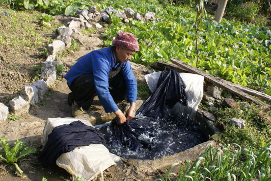從前壯族鄉(xiāng)村,普遍掌握制作藍(lán)靛及印染方法。一般置一大缸,將藍(lán)草放入浸泡,加石灰使之分解、發(fā)酵,經(jīng)過化學(xué)變化,而后濾去殘?jiān)?,蒸發(fā)水分,凝成糊狀藍(lán)色染料。其間需不斷攪動(dòng),使色素充分化解?!懊康宀萘俳?,造成一百斤之靛為佳?!币虍a(chǎn)量較多,遠(yuǎn)銷廣東。浸染時(shí),將適量靛糊化于染缸中,同時(shí)將雞血藤搗碎加入。布要反復(fù)浸泡多次,晾泡結(jié)合,直到染為深藍(lán)色。其間雞血藤釋放出一種紫紅色的植物膠,將藍(lán)靛色素粘在纖維上,是色素耐水耐腐耐紫外線,不易褪色,并有若隱若現(xiàn)的亮點(diǎn),結(jié)實(shí)美觀。這個(gè)過程,運(yùn)用了化學(xué)分解法。