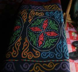 北方少數(shù)民族地區(qū)都沒有養(yǎng)蠶的條件,所以用于刺繡的絲線都需要與中原的物品交流當(dāng)中索取,這也是在蒙藏地區(qū)有用各色的布出現(xiàn)貼花的原因??茽柷哔N花就是把各式各樣布料剪成紋樣貼在布底上再經(jīng)過縫邊,鎖邊而成的一種刺繡種類。這種貼繡在科爾沁蒙古族中是很普及的一種形式。這種貼繡能較好地運用大塊面的色彩,用料簡單,是刺繡中常用的一種方法。科爾沁刺繡在面料上刺繡圖案時用三種方法,第一種是把刺繡的圖案畫在紙上在把紙樣按照輪廓剪下來,然后放在要繡的底樣上,按照紙樣的輪廓進行刺繡。第二種方法是把圖案如實地在錦緞上描下來進行刺繡。第三種是直接在錦緞上自由發(fā)揮,繡出各種圖案。