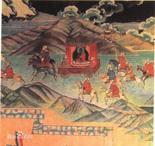 貞觀15年(641)正月十五,唐太宗將文成公主下嫁松贊干布,詔令江夏王李道宗持節(jié)護(hù)送。文成公主在唐送親使江夏王太宗族弟李道宗和吐蕃迎親專使祿東贊的伴隨下,前往吐蕃。文成公主一行從長(zhǎng)安出發(fā),途經(jīng)西寧,翻日月山,長(zhǎng)途跋涉到達(dá)拉薩。 松贊干布率群臣到河源附近的柏海(今青海瑪多縣境內(nèi))迎接文成公主,謁見(jiàn)李道宗,行子婿之禮。之后與公主同返邏些(今拉薩),為公主筑城、修建宮室。