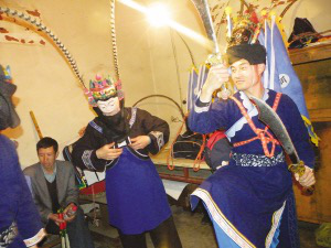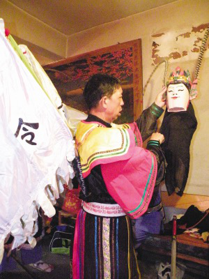 請“臉子”是地戲表演時一個非常講究的開場儀式。“屯堡地戲”的請臉子儀式通常是整個戲班子的人都必須參加祭拜。表演時必須鄭重地從箱子里請出珍藏的“臉子”,“臉子”才具有神的靈性??墒俏覀兛吹降拇笳家赖貞颍诒3謧鹘y(tǒng)的同時又不失自己的個性。通常請“臉子”是由當(dāng)?shù)亻L老一個人完成所有的祭拜過程,一切都是那么簡單。祭拜中都是用當(dāng)?shù)氐牟家涝掓告傅纴恚@樣的表演給它增添了別有的韻味。
