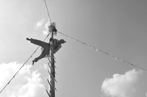 眾目睽睽下,徒弟們不敢丟臉,雖然內(nèi)心恐懼,但只能強(qiáng)裝鎮(zhèn)定。符長(zhǎng)洪的兒子、大徒弟符振德,慢慢地沿著刀梯挪向梯沿。他用手使勁攥住梯沿,單腳慢慢地踩上刀刃,試了試,安全,就將另一只腳也放上去。不一會(huì)兒,符振德順利地走下了刀梯。腳一沾地,他便樂(lè)開(kāi)了花:“我成功了!”其他幾個(gè)徒弟也效仿符振德的做法,第一次完成了“上刀梯”的表演。