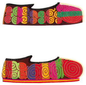 羌族男女皆穿羊皮坎肩和寬大袍衫、系腰帶,腳穿云云鞋,女子系繡花圍裙和飄帶,戴繡花頭帕。其中刺繡精美的云云鞋可以代表羌族刺繡的藝術水平,羊角花紋是云云鞋的主要紋飾,因其線條流暢如行云,故得名云云鞋。其實,這與羌人崇拜天神的信仰有關,天神就居住在高高的云空之中。此外,羊角紋還體現(xiàn)了羌人曾以羊為圖騰的古老信仰。關于云云鞋還有個傳說:相傳,一個生活在湖泊中的鯉魚仙子看見放牧的羌族少年赤腳,十分心疼,于是摘下一朵白云彩,折來一束羊角花,做成繡鞋相贈。后來他們相愛了,成了一對最幸福的人。從此這種有著羊角花紋的云云鞋就成了愛情的象征,羌族民間云云鞋也多作為情感的信物贈送意中人。千百年來,羌族刺繡就這么把美麗點綴在生活中,比傳說和記憶更生動美好。