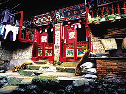 狹長式的房屋大都建在深山里幾十戶大小的村寨。面闊一間并開正門,室內(nèi)隔間向縱深排列,從正門到后門有7道門之多。正門是大門也是第一道門,是家族的門面,被視為招財(cái)進(jìn)寶和迎接貴客之門。對開門扇高大厚實(shí),門檻上又設(shè)兩扇雕刻彩繪的矮門,天熱開大門通風(fēng)時(shí),可以防止禽畜入戶。大門兩側(cè)掛有木刻大字對聯(lián),大門墻面的屋檐下則畫有七彩畫卷。